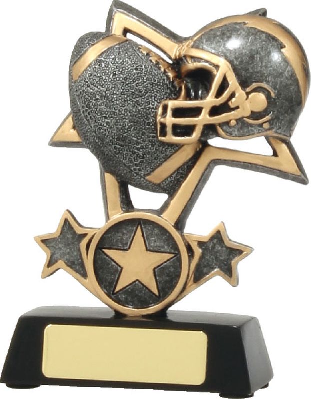 Affordable Gridiron trophy series in 3 sizes in classic antique silver and gold colours. A star inspired design featuring American Football design with helmet. A fantastic trophy idea for all ages, starting at a budget price point with the space for potential club logo inserts if required.